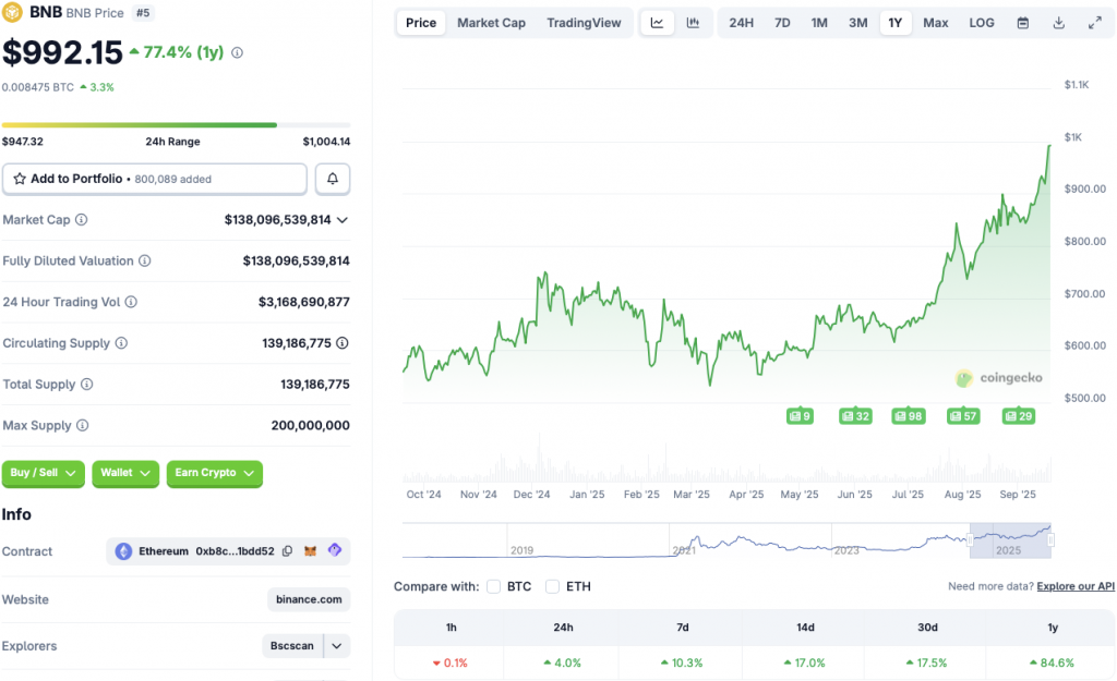 Binance’s BNB coin made history today by breaching the $1000 mark for the first time in its history. According to CoinGecko, BNB climbed to a new all-time high of $1,004.14 earlier today, Sept. 18, 2025. BNB has rallied 4% in the last 24 hours, 10.3% in the last week, 17% in the 14-day charts, and 17.5% in the previous month. Despite the rally, BNB’s price has faced a 1.3% correction since its peak earlier today.