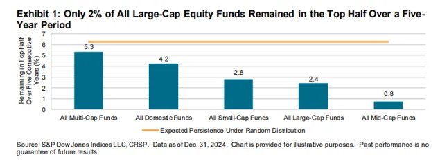S&P’s 2024 Persistence Scorecard underscores the fleeting nature of outperformance. In every category, the persistence of top-quartile performance was less than what would be expected by chance, reinforcing that past success is a poor predictor of future results.