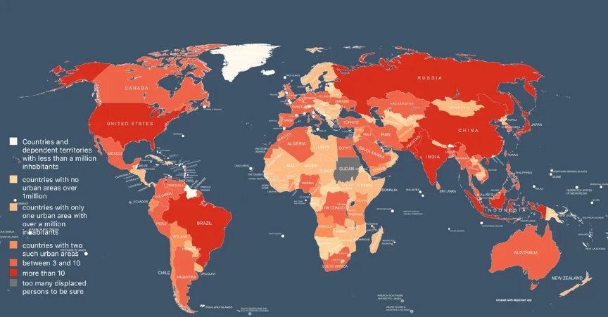 Look at a map of urban agglomerations below – cities with populations exceeding one million – and a stark pattern emerges. The United States, China, India, Brazil, and Russia are drenched in deep red: ten or more megacities each, sprawling networks of economic gravity.