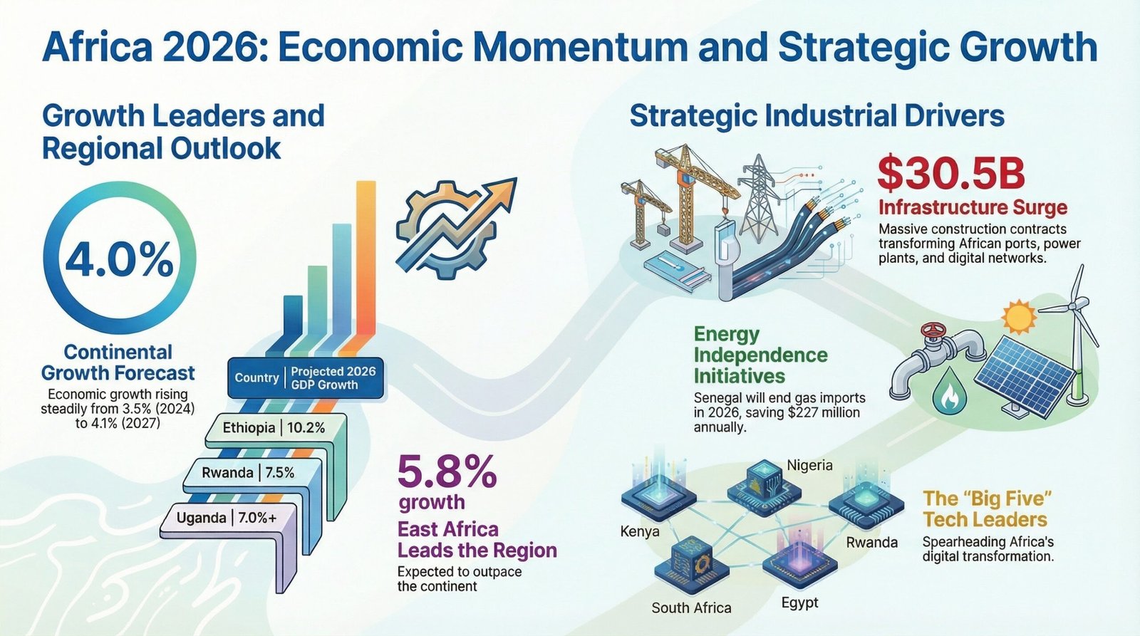 Projections drawn from the International Monetary Fund, African Development Bank and United Nations Economic Commission for Africa estimate that the continent could grow by about 4 percent in 2026, while the global average may be closer to around 2.7 percent. Performance is strongest in East Africa, with forecast growth at around 5.8 percent.