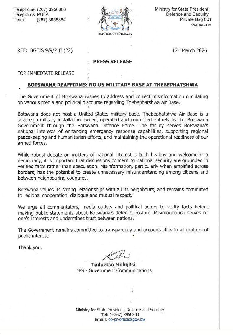 In a statement signed by Tuduetso Mokgosi, Director of Public Service – Government Communications, the Botswana government confirmed that Thebephatshwa Air Base is a sovereign military installation, fully owned, operated, and controlled by the Botswana Defence Force