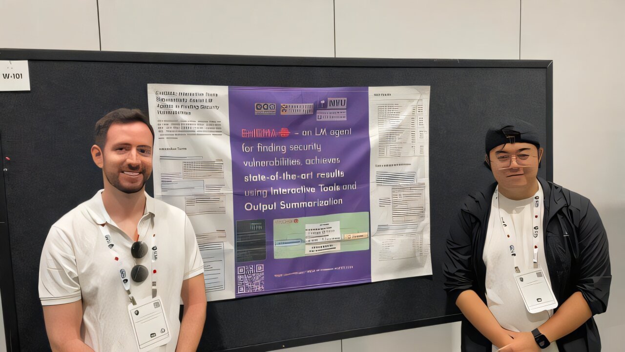 EnIGMA presentation at ICML 2025. Researchers Talor Abramovich (left) and Minghao Shao (right). Credit: Minghao Shao