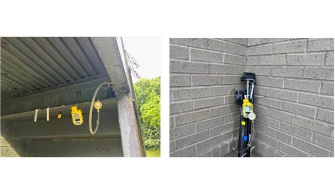 Photos of air quality monitoring equipment show them close to buildings.