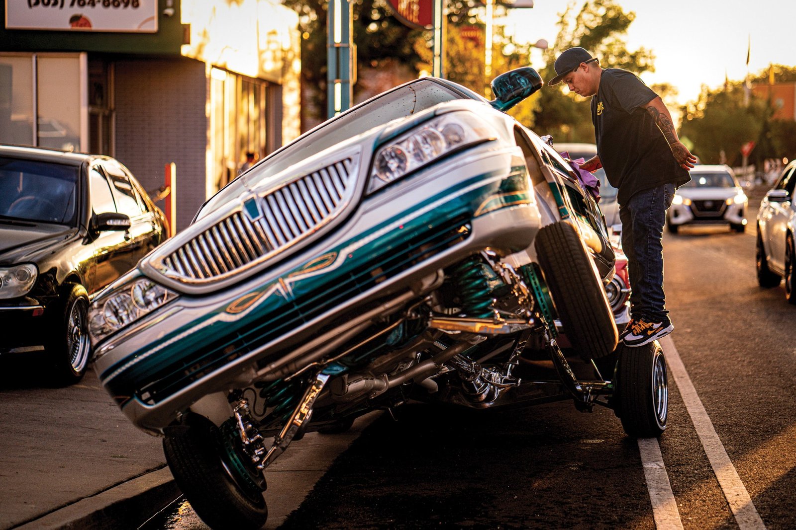 Jay Sanchez wipes the raindrops off his 1999 Lincoln Town Car, which goes by the name “Hustler’s Ambition,” as it sits on three wheels on Albuquerque’s Central Avenue, June 2024 (top). James Valdez and his family drive their Impala toward the Cathedral Basilica of St. Francis of Assisi in Santa Fe, March 2017 (left). Laura Peralta looks out the window of Joseph “Star” Vigil’s 1985 Cutlass Supreme while cruising on three wheels through downtown Albuquerque, April 2023 (right). Gabriela Campos/High Country News