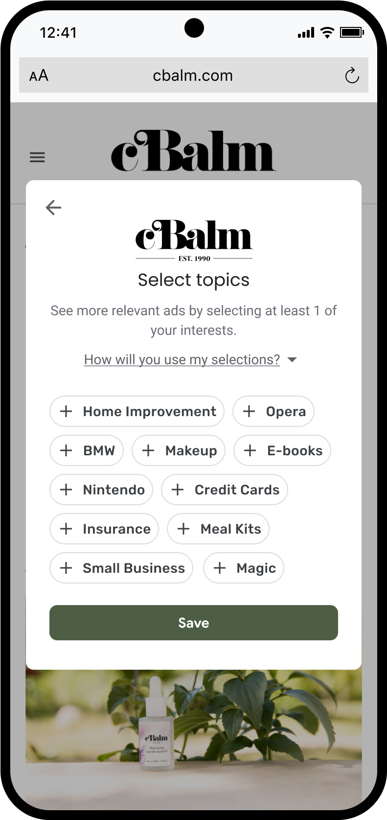 Another option has visitors click to choose from a set of topics they’re interested in, which is then saved and used for ads personalization.