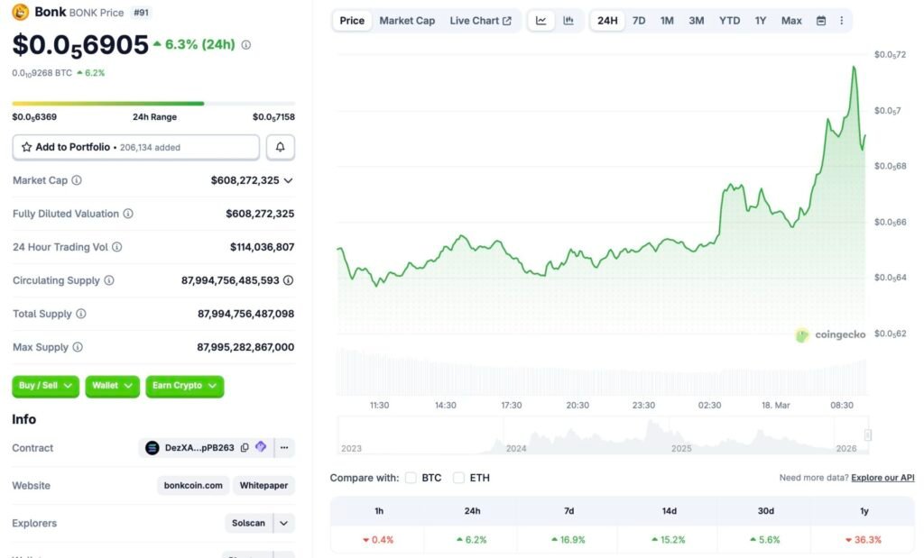 Bonk (BONK) is experiencing quite a price surge today, March 18, 2026, after months of struggle. According to CoinGecko’s BONK data, the Solana-based memecoin has rallied 6.2% in the last 24 hours, nearly 17% in the last week, 15.2% in the 14-day charts, and 5.6% over the previous month. In fact, BONK is currently outperforming top crypto assets, such as Bitcoin (BTC), Ethereum (ETH), XRP, etc. Let’s discuss if BONK can continue its upward momentum, or will its price rally come crashing down.