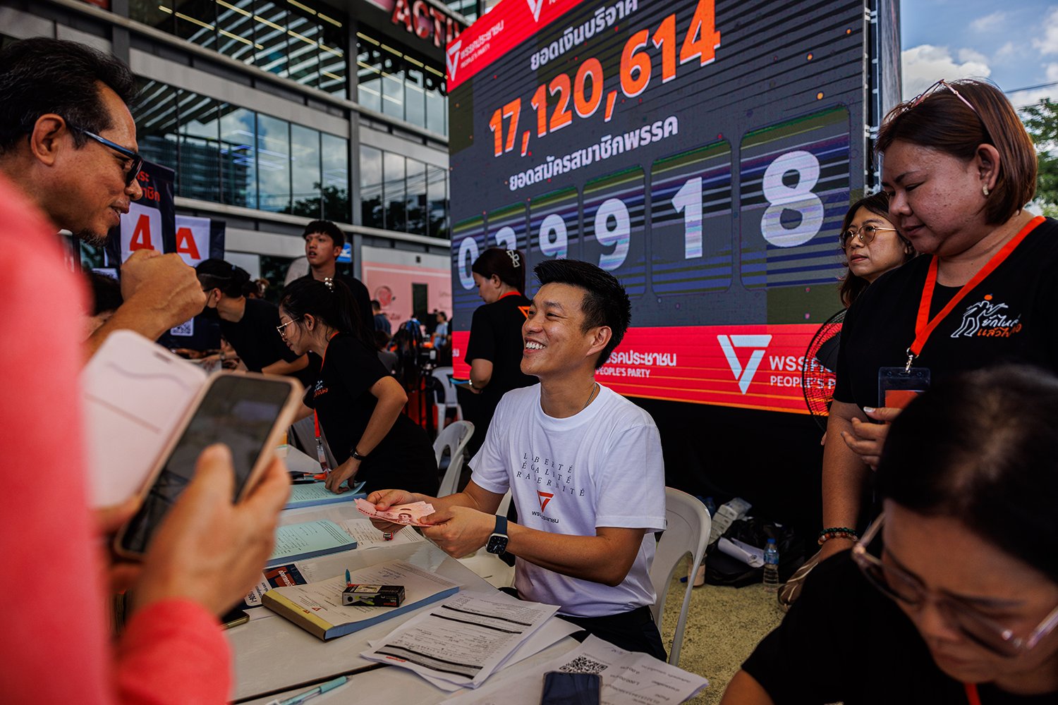 People’s Party leader Natthaphong Ruengpanyawut accepts donations from a supporter at a party recruitment event in Bangkok on Aug. 10, 2024.Lauren DeCicca/Getty Images