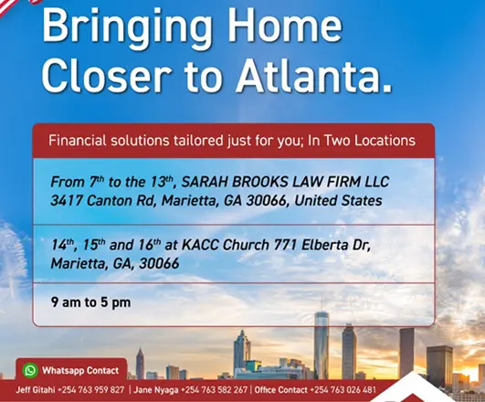 Atlanta, GA – Equity Bank’s Diaspora Team has arrived in Georgia, USA, to bring financial services closer to Kenyans living and working abroad. The team will be available from November 7th to 13th at Sarah Brooks Law Firm LLC, 3417 Canton Rd, Marietta, GA 30066, and from November 14th to 16th at KACC Church, 771 Elberta Dr, Marietta, GA 30066, between 9:00 am and 5:00 pm daily.