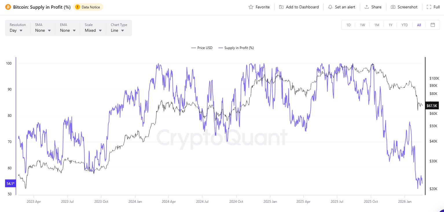 Currently, only 55% of the BTC supply is held in profit, down from over 99% in October 2025. The longer period of weakening prices has led to a mix of strategic selling, panic, and capitulation.