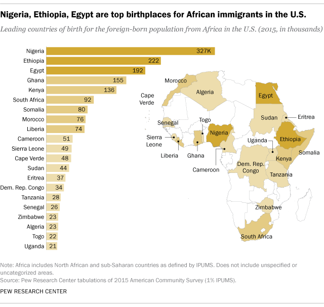 Foreign-born Africans in the United States hail from all regions of the continent. The best represented countries are Nigeria, Ethiopia, Egypt, Ghana and Kenya, accounting for 50% of the foreign-born African population in the U.S in 2024.