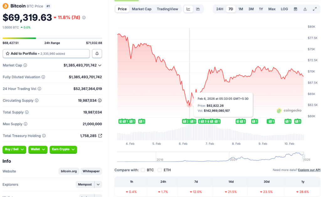 Bitcoin (BTC) is nearly down to its 2021 peak. The original crypto fell to as low as $62,822 on Feb. 6, 2026, but has since made a slight recovery. BTC’s price could see further corrections as we enter bear territory. According to CoinGecko data, BTC is down 1.7% in the last 24 hours, 12% in the last week, 21.5% in the 14-day charts, and 23.5% over the previous month. Moreover, the asset is down by 45% from its all-time high of $126,080, which it attained in October of last year. Let’s discuss why buying Bitcoin (BTC) now could double your money in the next bull run.