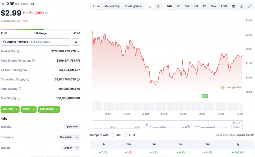 Ripple’s XRP token is facing some resistance at the $3 price level. According to CoinGecko’s XRP data, the asset is down by 1.1% in the last 24 hours. Despite the dip in the daily charts, XRP is trading in the green zone in the other time frames. The popular crypto has rallied 3.6% in the weekly charts, 6.3% in the 14-day charts, and 6.3% over the previous month. Let’s discuss if XRP can follow Bitcoin (BTC) and BNB’s trajectory to a new all-time high in October 2025.