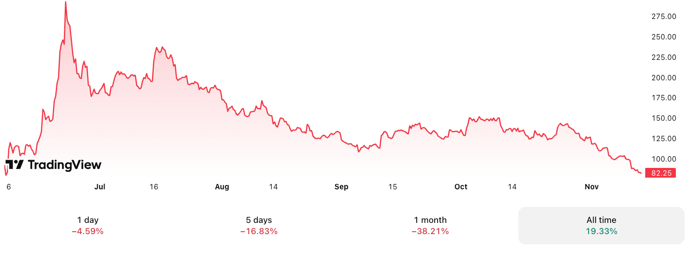 The stock quickly surged to an all-time high of nearly $299 by June 23, but soon faced a sharp sell-off, falling below $200 in July. After losing $100 support on Nov. 11, Circle shares continued dipping further, briefly dropping to $81.40.