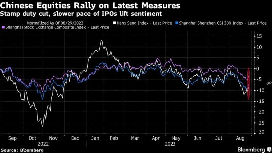 Chinese equities rallied as the government lowered stamp duty on stock trades for the first time since 2008 and pledged to slow the pace of initial public offerings. The CSI 300 Index was on course for the biggest gains in more than a month, while the Shanghai Composite Index looked poised to rise the most since November.