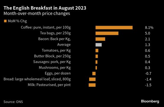 The total cost of all the components of a fry-up rose by 57 pence to £36.15 ($44.81) in August. Bloomberg’s monthly Breakfast Index uses product sizes provided by the Office for National Statistics to crunch prices of sausages, bacon, eggs, bread, butter, tomatoes, mushrooms, milk, tea and coffee.