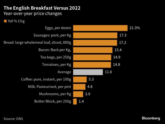 The cost of a full English breakfast has risen to the highest on record even as broader measures of inflation ease, a sign of just how hard it is for British consumers to shake off rising food prices.