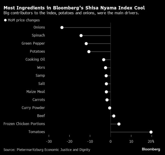 A sharp drop in onion and potato prices, which have declined 24% and 11% respectively, cooled the overall pace of increase in Bloomberg’s Shisa Nyama Index to 10% last month versus a 17% gain in October.