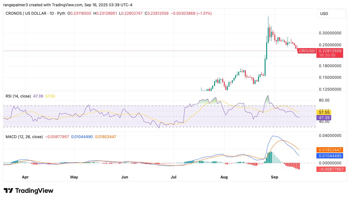 As of September 16, 2025, Cronos (CRO) is down 4.5%, reflecting the broader bearish sentiment in the cryptocurrency market. The decline is mainly due to ongoing market pressure, with regulatory uncertainty and cautious investor sentiment hindering price growth. Additionally, CRO has struggled to break above the key resistance level at $0.2391, limiting any significant upward movement. With sellers continuing to dominate the market and no immediate signs of a reversal, the price remains trapped in a downtrend, further contributing to the decline in Cronos.