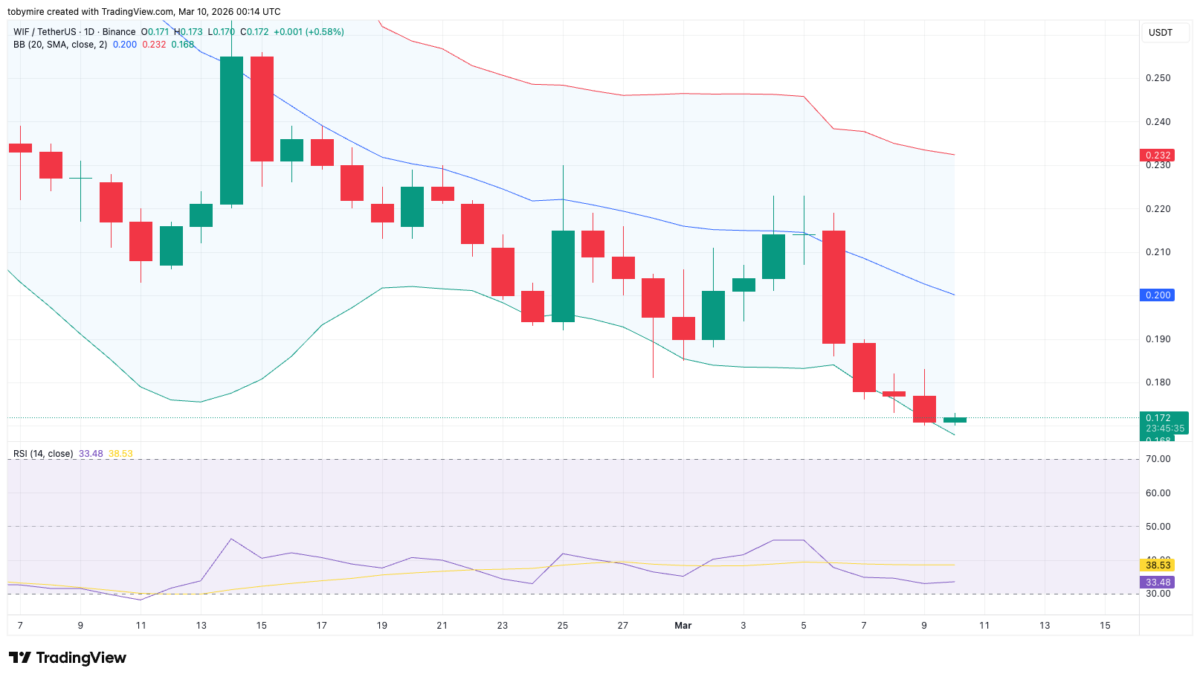 On the daily timeframe for March 10, WIF trades around $0.172, barely up +0.58%, but the broader structure remains decisively bearish after the rejection near $0.26, marking roughly a 34% decline from that recent peak. The price continues printing lower highs and lower lows while sitting below the 20-day moving average near $0.200, confirming sellers still control momentum.