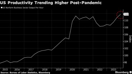 This month, economists marked up their forecast for 2024 US growth to 2.1% and lowered the odds of a coming recession to 40%, according to the latest monthly Bloomberg survey of economic forecasters.