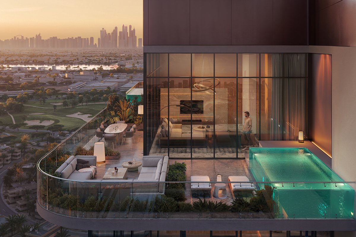 Penthouses in the development include terraces with private pools and city views, while interiors feature European-inspired designs.