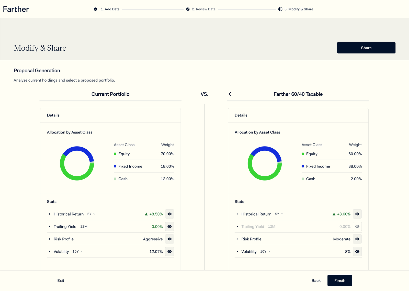 Early internal research from Farther shows its new tool cuts time for an advisor to create a proposal down to seven minutes on average. The proposal process could traditionally take hours for advisors and typically requires them to use Excel, PowerPoint and other third-party platforms to analyze data and present to clients, which Farther says creates more compliance obstacles and data risk exposure than its new in-house AI tool.