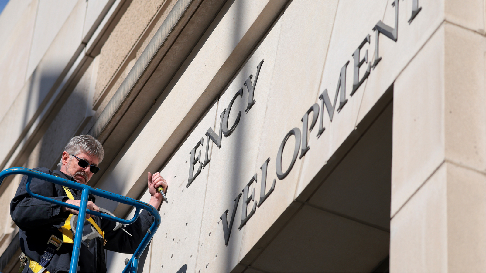 A worker removes the U.S. Agency for International Development sign on their headquarters on February 07, 2025 in Washington, DC. Image: Kayla Bartkowski/Getty Images