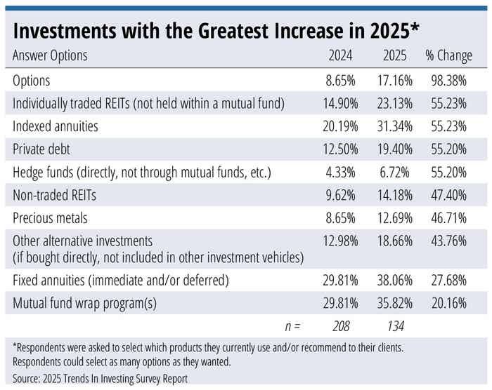 The share of planners using individually traded REITs increased to 23.13%, indicating a 55.23% change. Planners using private debt now make up 19.4% of those surveyed, up 55.2% year-over-year. Non-traded REITs experienced a 47.4% increase in usage from 2024, with 14.18% of planners reporting they now incorporate these investments.