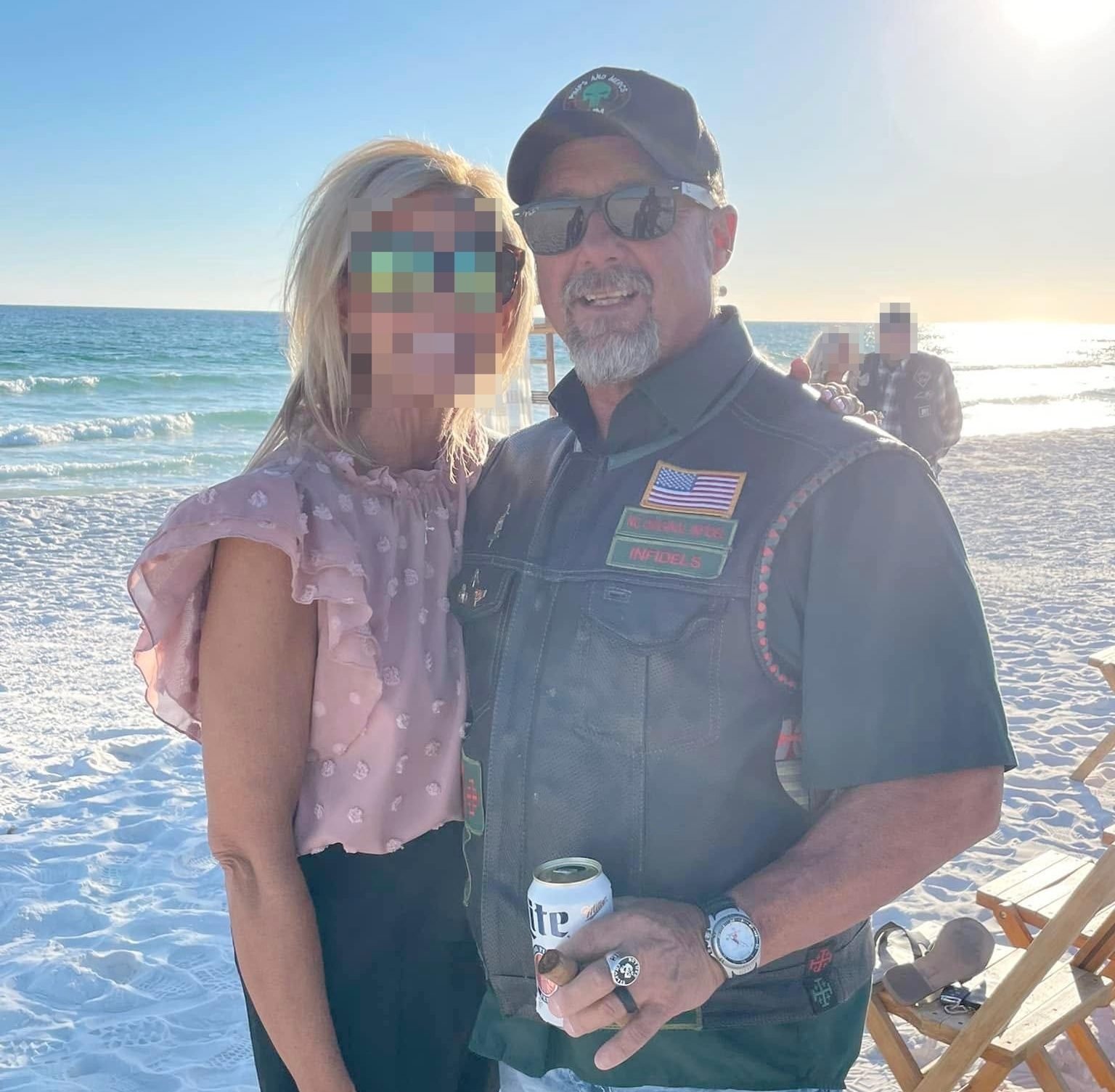 Mulford, who registered the local chapter in Florida, is an active member of the Infidels, according to his and others’ social media postings. He is frequently shown in photos online posing with fellow club members at meet-ups. The Infidels wear matching leather vests bearing the club name and a red cross on the back. In one photo, Mulford’s vest has an embroidered patch on the front that says “Original Infidel.”