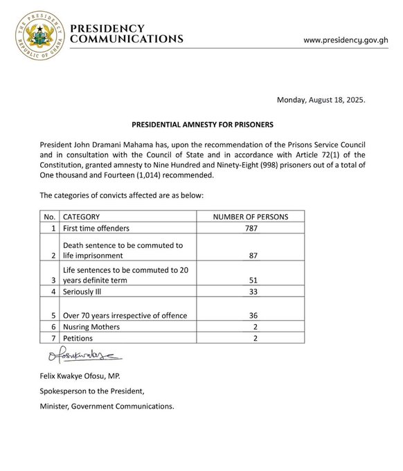 The decision, announced in a statement by the Minister for Government Communications, Felix Ofosu, followed recommendations from the Prisons Service Council and was taken in consultation with the Council of State, in line with Article 72(1) of the 1992 Constitution.