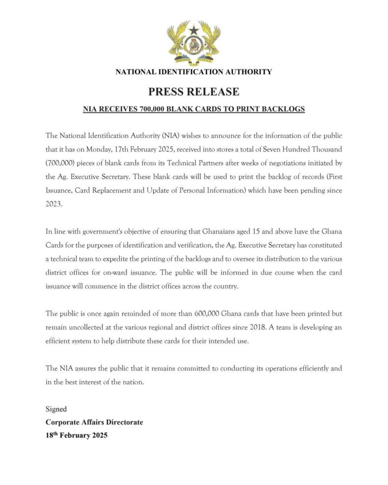 The National Identification Authority (NIA) has received 700,000 blank Ghana Cards to address the backlog of unprinted cards from 2023.