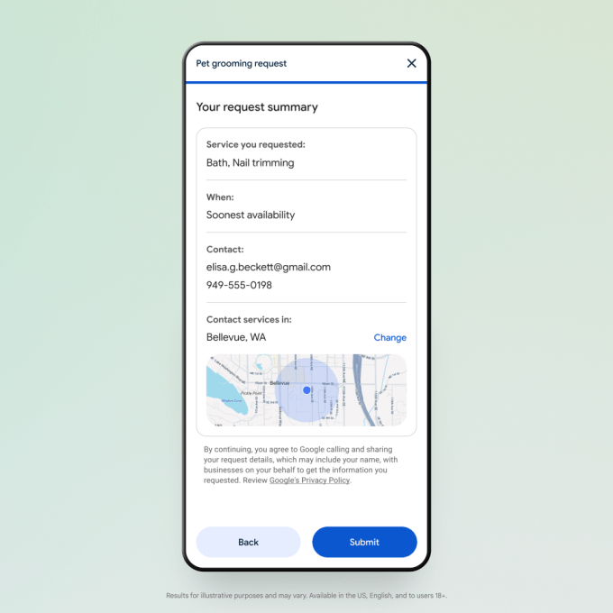 To get started, you need to search for something like “pet groomers near me,” and you’ll see a new option in the results to “Have AI check pricing.” From there, you answer a couple of questions to receive information about appointments and services from different local businesses. For example, you will be asked what type of pet you have, what services you need, and when you need the service.