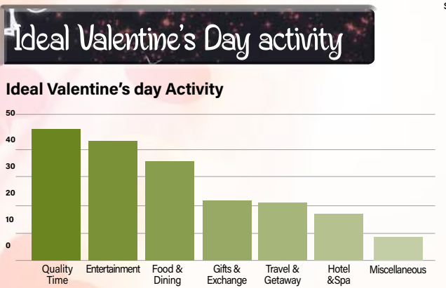 Shopping Preferences: Ideal Valentine’s Day activity. The majority of individuals (24.10%) would rather spend quality time dating, while 22.50% prefer to spend it on leisure and activities. 18.70% choose eating and dining, 11.80% prefer gift exchange, and 10.70% like to travel or go on vacation.