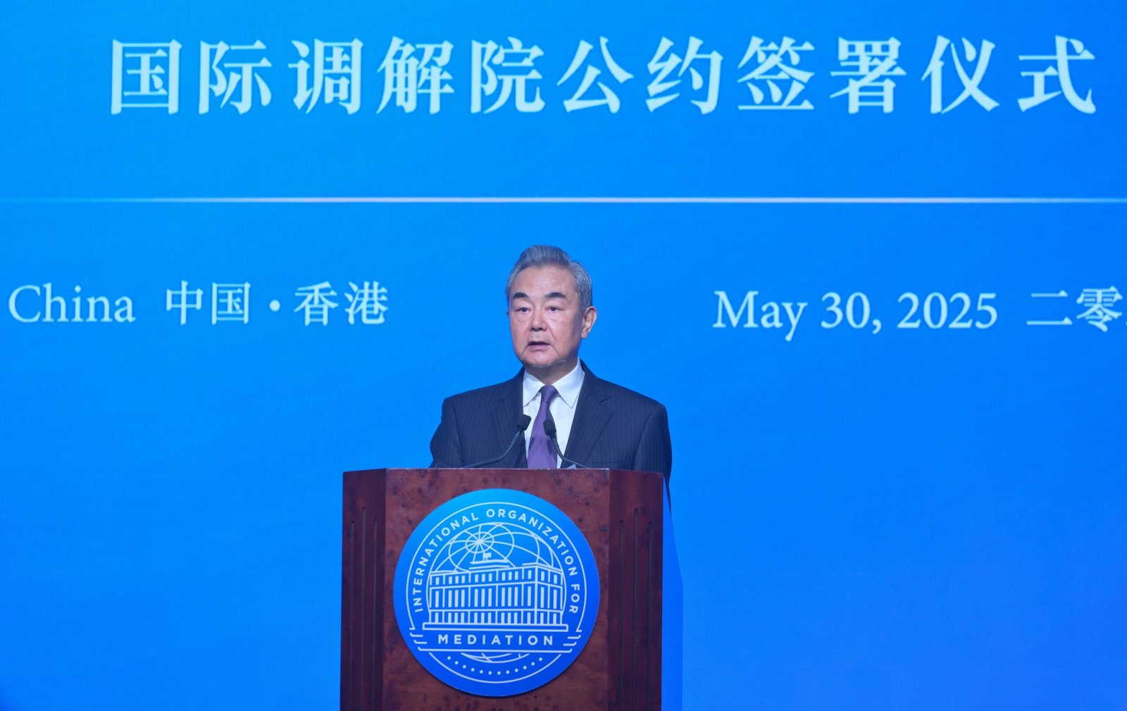Member of the Political Bureau of the Communist Party of China Central Committee and Minister of Foreign Affairs of the People’s Republic of China, Wang Yi, speaks at the Signing Ceremony of the Convention on the Establishment of the International Organization for Mediation and is the first to sign the Convention on behalf of China.