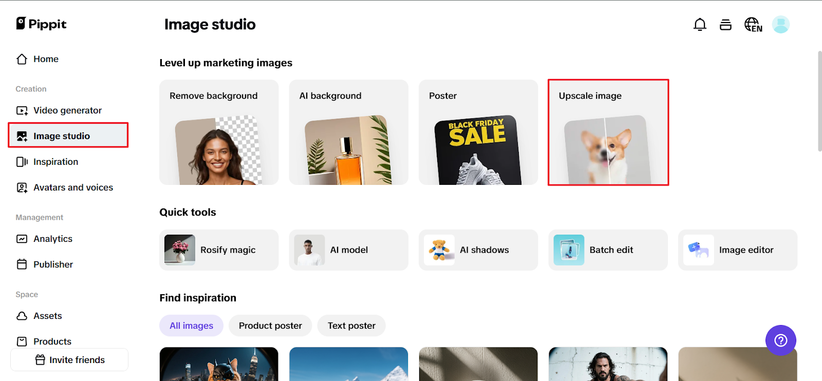 Open Pippit, sign in, and head to the Image Studio. Click ‘Upscale Image’ and upload any image from your device—even the tragic ones. You’re about to work magic.