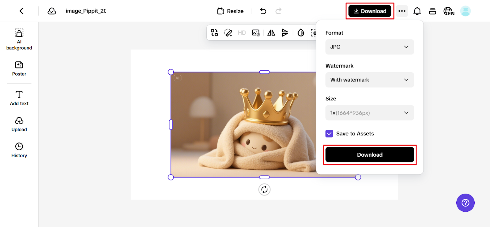 Click Download in the top corner, choose your size and format, and hit export. Whether it’s for Instagram, a digital ad campaign, or grandma’s birthday slideshow—your image now glows.