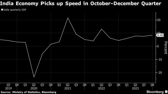 India’s economic growth accelerated to more than 8% in the final three months of last year, beating all forecasts by economists just months before an election, even though one key figure showed slowing momentum.