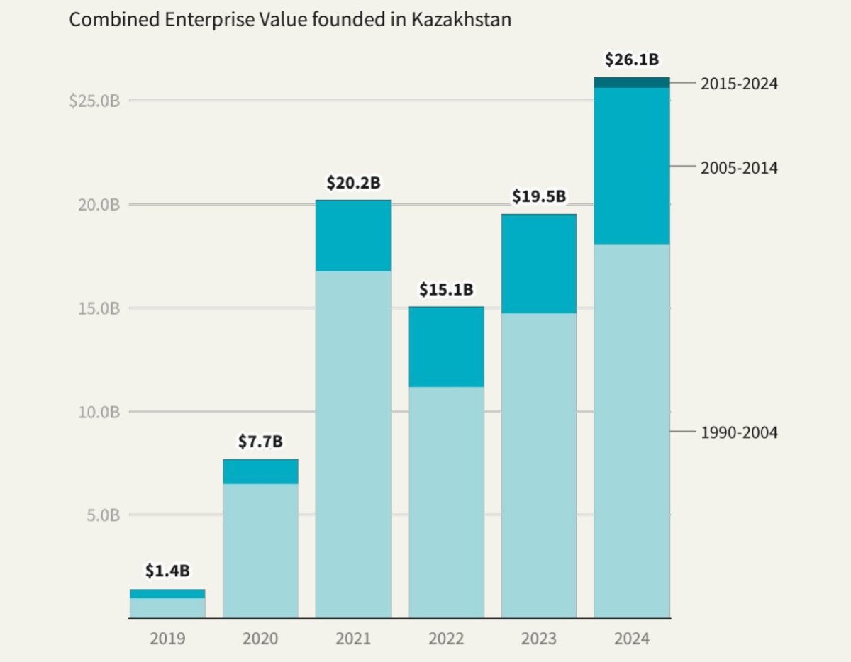 The report also valued Kazakhstan’s tech ecosystem at $26 billion — an 18-fold jump since 2019 — suggesting a sharp rise in local startup formation, funding, and digital services.