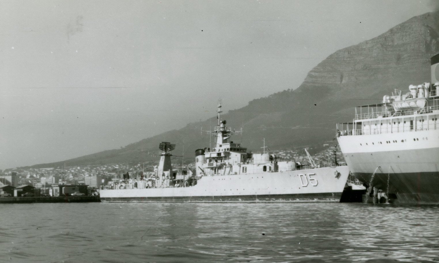 The modified Battle-class destroyer IIS Artemiz alongside at Globe Engineering in Cape Town harbour in 1974. (Bill Rice)