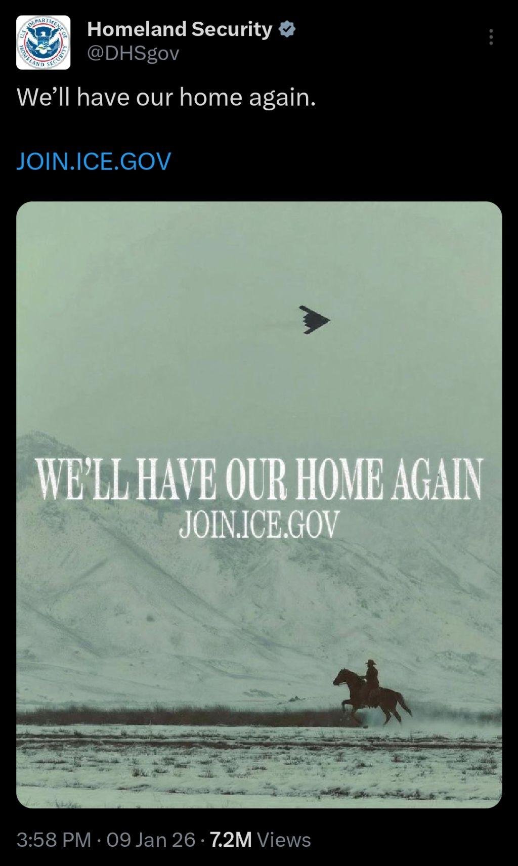 The most controversial ad in the campaign was a paid DHS recruitment post that published less than two days after the fatal shooting in Minneapolis. It paired immigration enforcement footage with the song “We’ll Have Our Home Again” by Pine Tree Riots. Popular in neo-Nazi online spaces, the song includes lyrics about reclaiming “our home” by “blood or sweat.” In the ad, it played as a cowboy rode a horse with a B-2 Spirit bomber flying overhead.