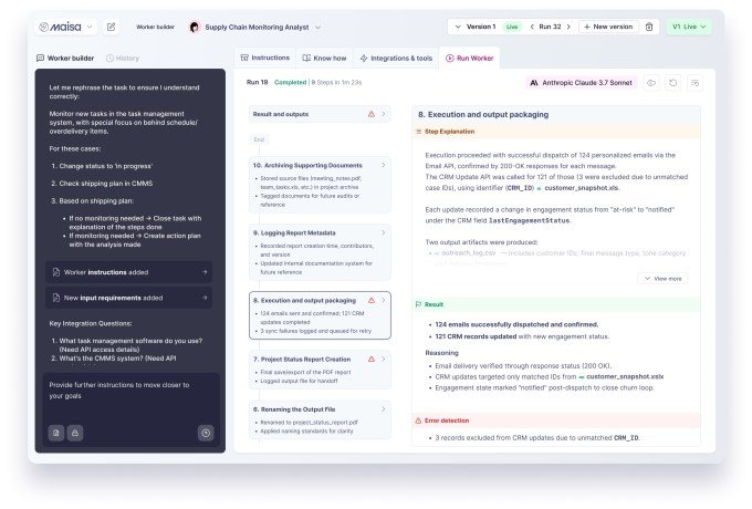 Focusing on complex use cases demanding accountability from non-technical users could be a differentiator for Maisa, whose competitors include CrewAI and many other AI-powered, business-focused workflow automation products. In a LinkedIn post, Villalón highlighted this “AI framework gold rush,” warning that the “quick start” becomes a long nightmare when you need reliability, auditability, or the ability to fix what went wrong.”