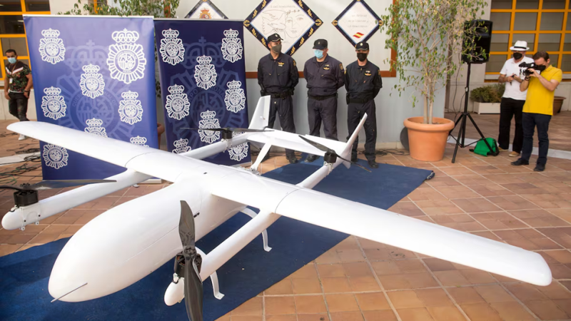 In July 2021, Málaga police displayed a white, tailless UAV with a 4.5 m wingspan, then the largest drone ever seized for narcotrafficking between Spain and Morocco. According to the police report, the seized UAV had the capability of carrying 150 kg of narcotics over seven hours at speeds up to 170 km/h. Manufactured in China, it combined four electric motors for vertical lift with a combustion engine for cruise flight. Police traced its flight path from rural Morocco to a drop zone near Almáchar, Andalusia, and warned of the collision risk such large VTOL craft pose to civilian air traffic.