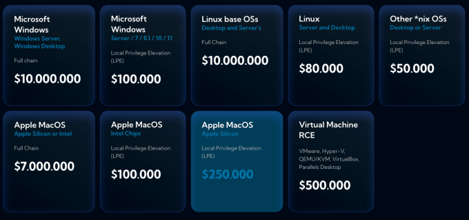 A screenshot of the bounties offered by Advanced Security Solutions for zero-days in operating systems. (Image: techcrunch)