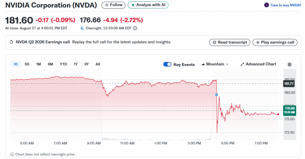 Nvidia stock actually fell about 3% in after-hours trading Wednesday, even though the company beat Q2 earnings expectations. The drop happened because data center revenue was missed by analysts and China restrictions are still weighing on investor sentiment right now. The Nvidia stock earnings report showed $46.7 billion in revenue along with $1.04 adjusted EPS, both numbers that exceeded what analysts were expecting, yet Nvidia (NVDA) stock price declined anyway due to concerns about geopolitical risks and some slowing growth momentum.