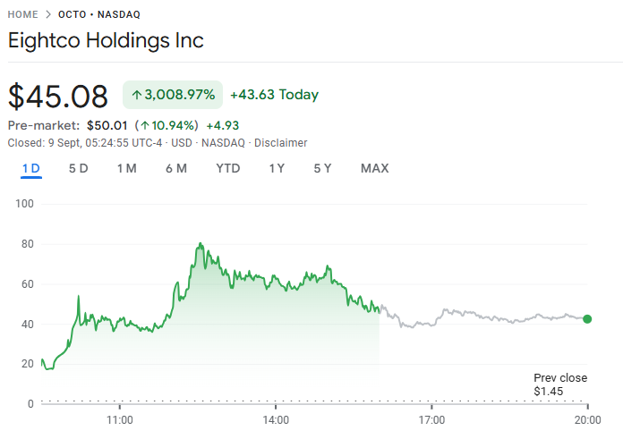 OCTO stock has actually surged over 1000% in pre-market trading after Eightco Holdings announced a groundbreaking $250 million partnership with Worldcoin. The OCTO stock price jumped from $1.45 to around $15.12 as Eightco secured Dan Ives as Chairman and also revealed plans for the world’s first Worldcoin treasury strategy. Right now, this marks one of the biggest single-day gains on record for the stock.