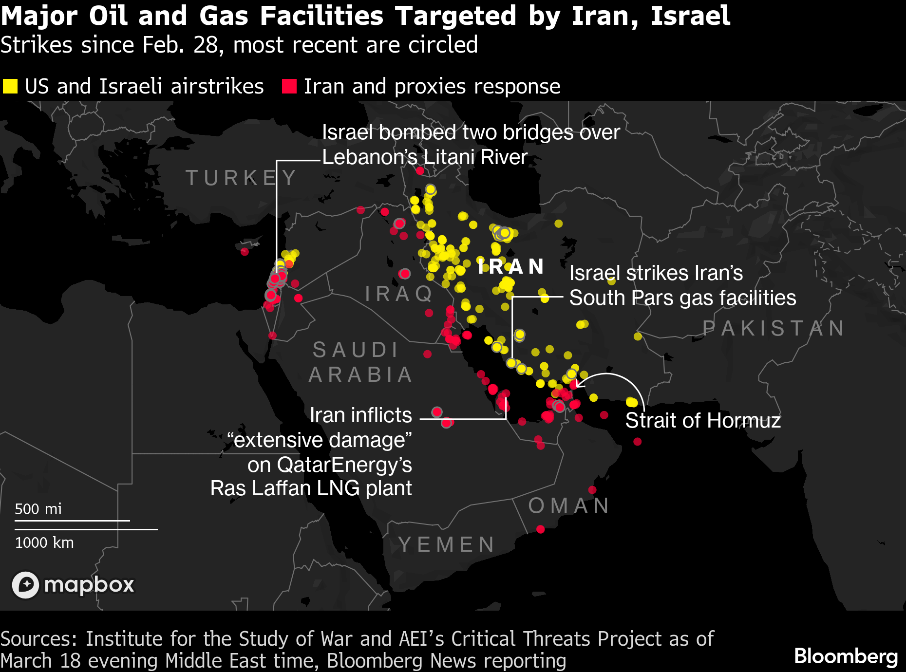 An Iranian missile strike on the Ras Laffan complex in Qatar caused extensive damage to the world’s largest liquefied natural gas plant. Two facilities that produce 17% of the country’s LNG exports, or about 13 millions tons a year, were affected and it will take three to five years to repair them, QatarEnergy Chief Executive Officer Saad al-Kaabi told Reuters.