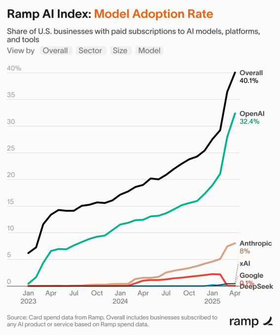 According to Ramp’s AI Index, which estimates the business adoption rate of AI products by drawing on Ramp’s card and bill pay data, 32.4% of U.S. businesses were paying for subscriptions to OpenAI AI models, platforms, and tools as of April. That’s up from 18.9% in January and 28% in March.