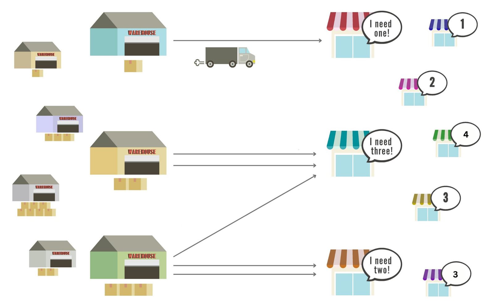 A simplified illustration of the Optimal Transport (OT) problem. Deceptively simple on the surface, the computational complexity of working out the optimal route for moving all the goods between the distribution points (warehouses and shops) increases dramatically with the number of points. Credit: Kaori Serakaki (OIST)
