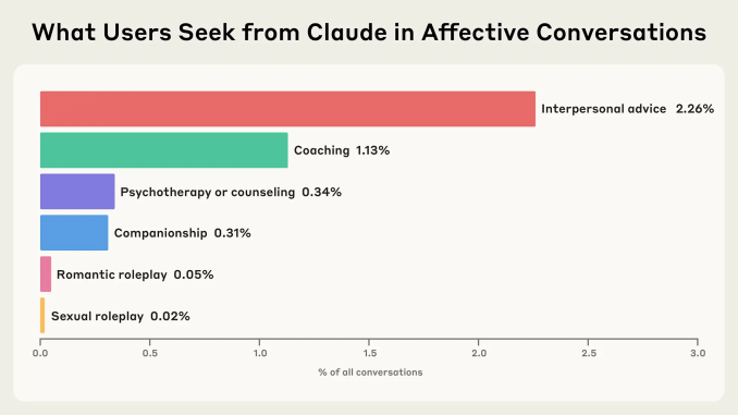 Anthropic says its study sought to unearth insights into the use of AI for “affective conversations,” which it defines as personal exchanges in which people talked to Claude for coaching, counseling, companionship, roleplay, or advice on relationships. Analyzing 4.5 million conversations that users had on the Claude Free and Pro tiers, the company said the vast majority of Claude usage is related to work or productivity, with people mostly using the chatbot for content creation.