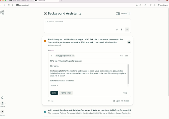 The assistant performs multiple tasks on your computer in the background while you do other work or walk away to make a sandwich. In an example a spokesperson gave me, you could give the assistant a task to send an email, add the cheapest tickets to a concert to your cart, and find the best direct flight on a specific date and time. You can check the progress of the task completion in the dashboard and jump in to complete the tasks — like hitting send on the email, intervening, or taking over. The assistant will notify you when it has finished its task.